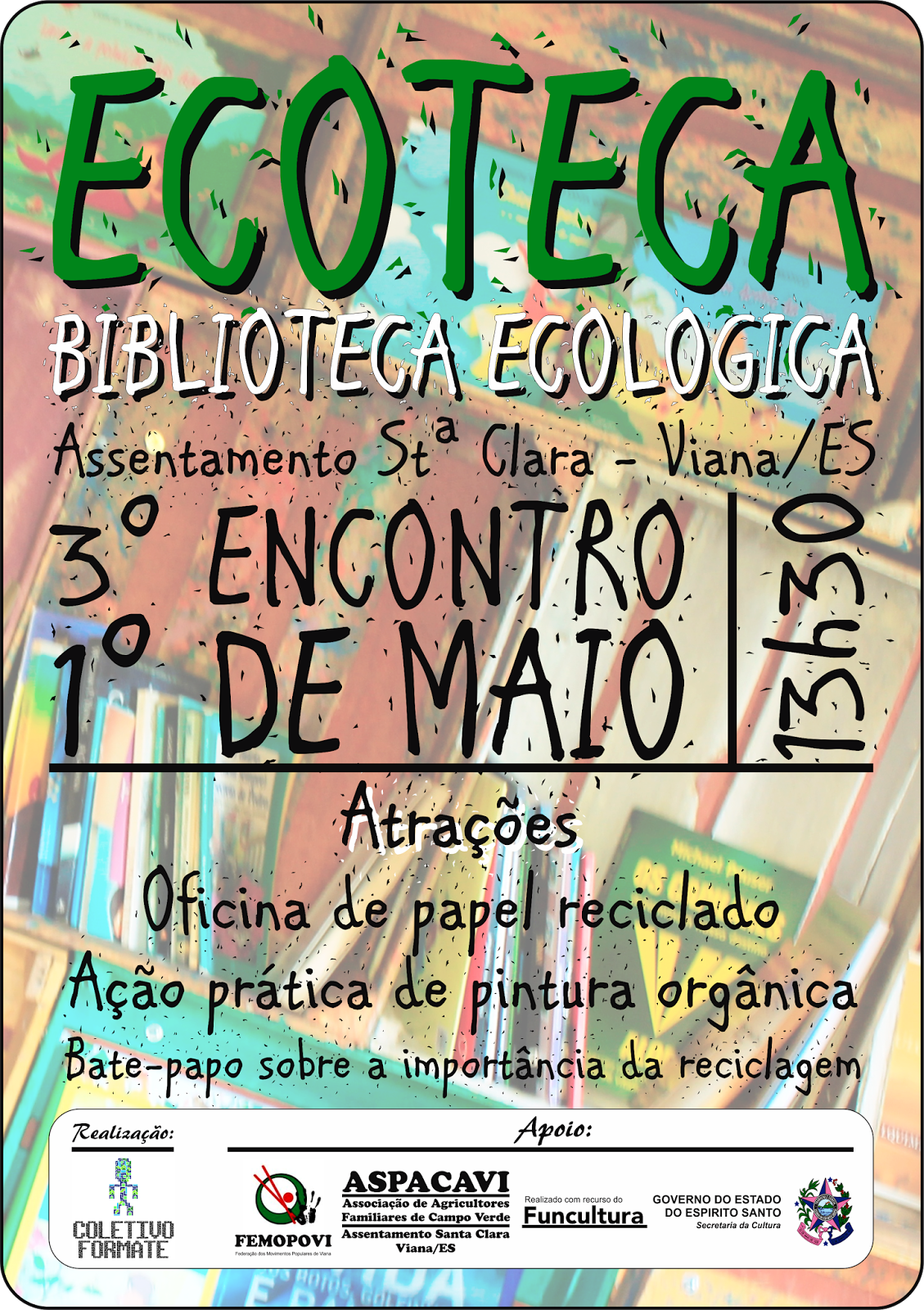 O Coletivo Formate tem o prazer de convidá-los a participar do terceiro encontro da Ecoteca, que é um projeto de Biblioteca Ecológica que foi aprovado no edital nº 023/2015 (seleção de projetos culturais e concessão de prêmio ao desenvolvimento e manutenção do cineclubismo) da Secretaria de Estado da Cultura (Secult/ES) e é financiado com recursos do Funcultura.Desde janeiro a galera do coletivo tem ido até o Assentamento Santo Clara, em Viana e recebido apoio voluntário de vários amigos como a Associação de Agricultores Familiares de Campo Verde (Aspacavi) e a Federação dos Movimentos Populares de Viana (Femopovi) para recuperar a sala que abriga as instalações da Ecoteca.
